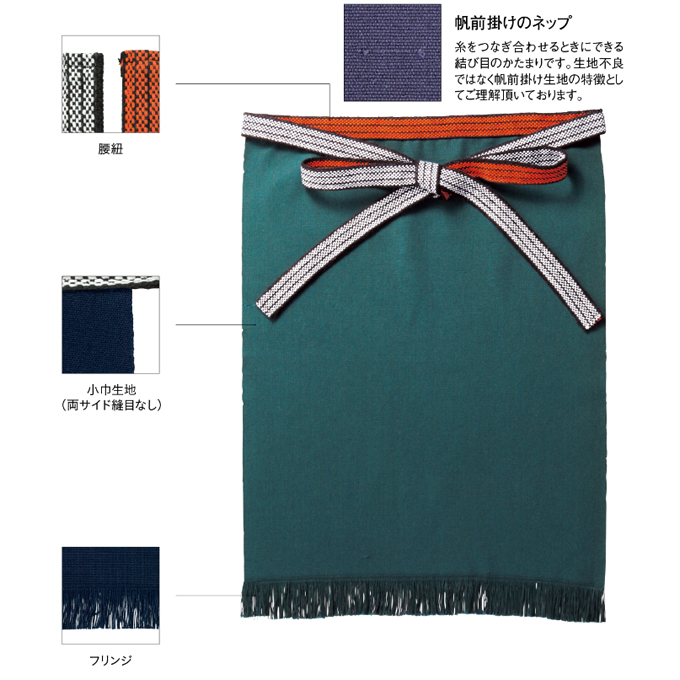 帆前掛けには、子巾用織機で織り上げられた丁寧な生地が使用されています。その細かな織り目と心地よい風合いは、着る人に安らぎと快適さを提供します。