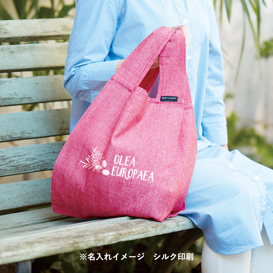 再生ファブリックの自然な風合いが、ナチュラルな表情を作るデイリーバッグ。クルリト最大の特長であるゴムバンドで留めると手の平サイズに折りたためて、持ち歩きやすさも抜群です。容量も十分で、ランチタイムの持ち歩きや、お買いものバッグにも使いやすいサイズ感。ベーシックな4色展開で企業ロゴも映えます。