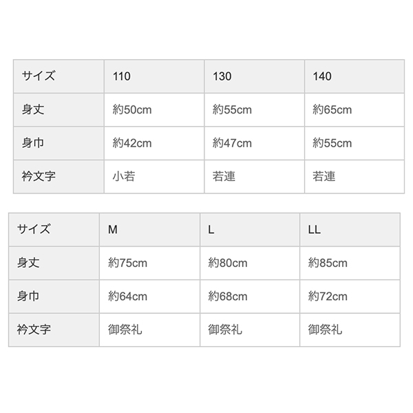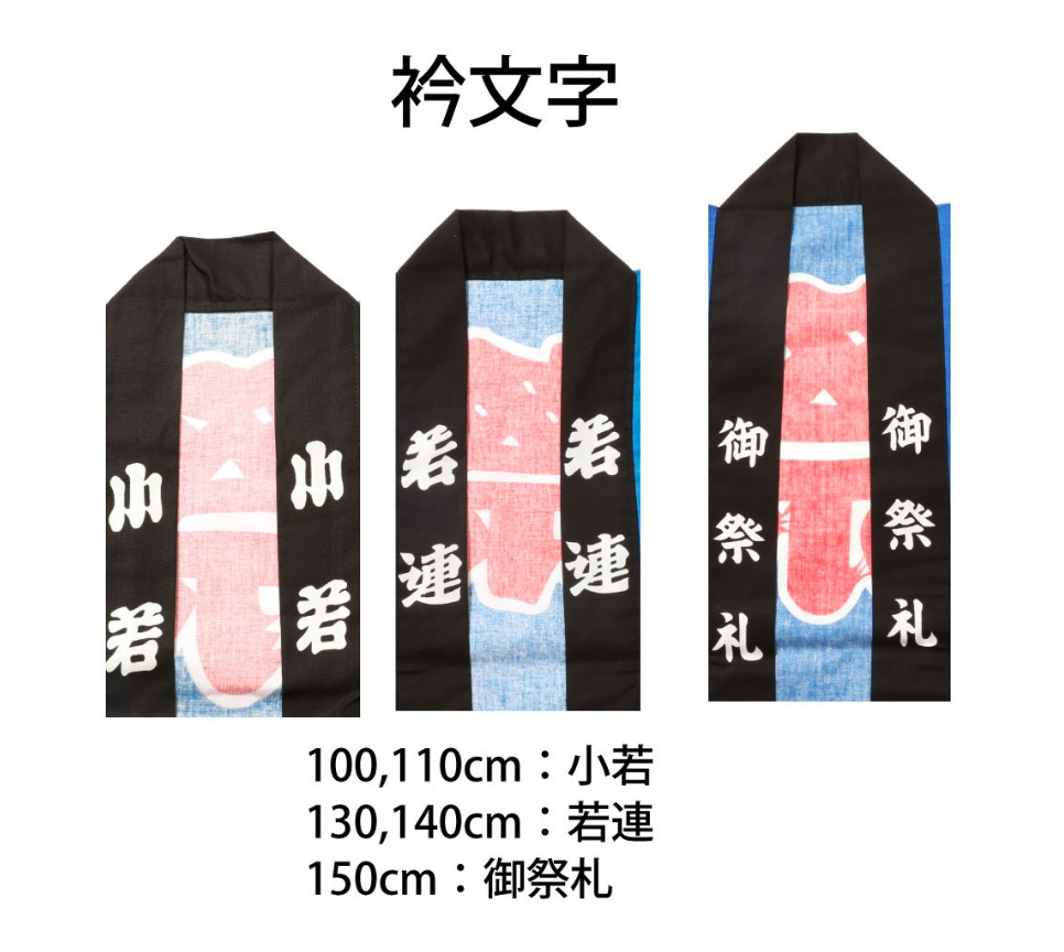 襟/小若(110サイズ)、若連(130、140サイズ)、御祭礼(M、L、LLサイズ)