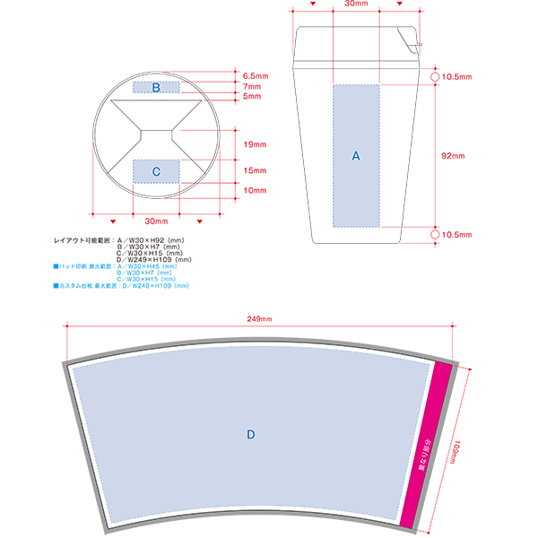 ●プリント可能範囲:天面/W30×H15(mm) / 側面/W30×H45(mm) 台紙/W249×H109(mm)