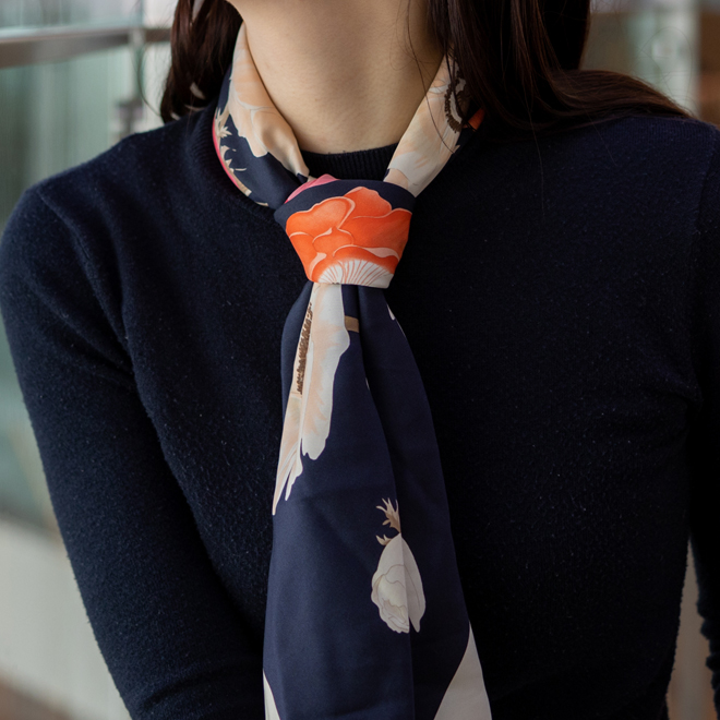 幅広い生地から選べるオリジナルスカーフ ─ シルクサテンやポリエステルで思い通りの仕上がり
