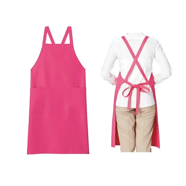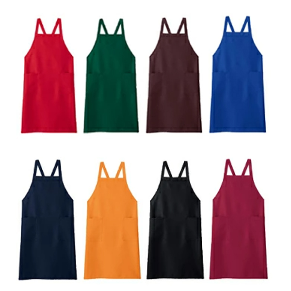 胸当てエプロン FK7168は、シンプルで使いやすいデザインと耐久性に優れた生地が特長の定番エプロンです。