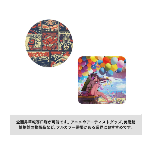 全面昇華転写印刷が可能で、アニメやアーティストグッズ、美術館博物館の配布品、物販品など、フルカラー需要がある業界におすすめです。