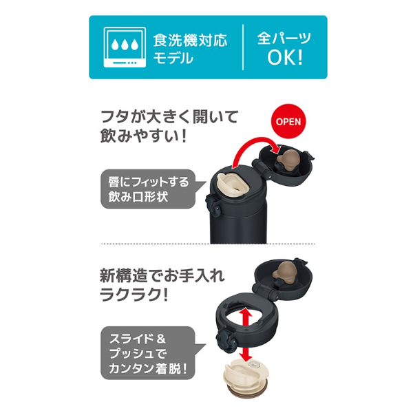 飲み口がより丸みを帯びた形状になり、唇にフィットして飲みやすさが向上しています。重さはわずか約210g。全パーツ食洗機対応。