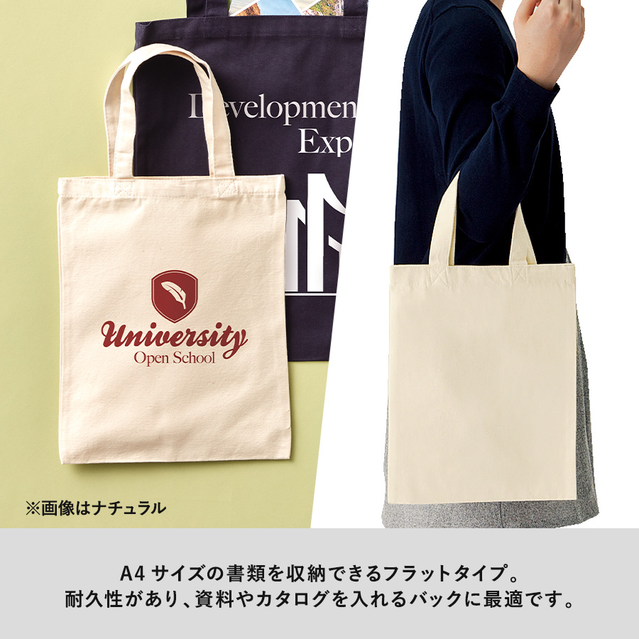 A4サイズが入るコットン生地のフラットトートバッグ。程よい厚みで、展示会カタログや書類を入れるのに最適です。シンプルなデザインだから名入れが映え、販促効果もバッチリ。単色〜フルカラー印刷まで対応し、ノベルティ・購入特典・物販まで幅広くご提案できます。