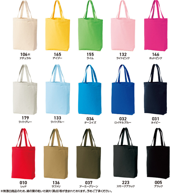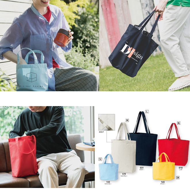 15カラー×5サイズの豊富なバリエーションにより、オリジナルアパレル キャンバストートやオリジナル販促・ノベルティグッズとしても高い人気を誇ります。シンプルな無地トートに、ロゴやイラストを名入れすることで、ブランドイメージやイベントの世界観をしっかりと表現できます。