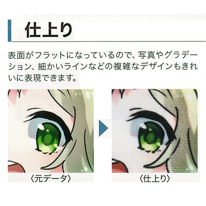 昇華転写印刷により、人物写真の肌質や髪質、繊細なグラデーションも美しく表現でき、高級感のある仕上がりになります。キャラクターグッズ、アーティストイベントグッズ、スポーツイベントの販促品など、幅広いシーンでご活用いただけます。